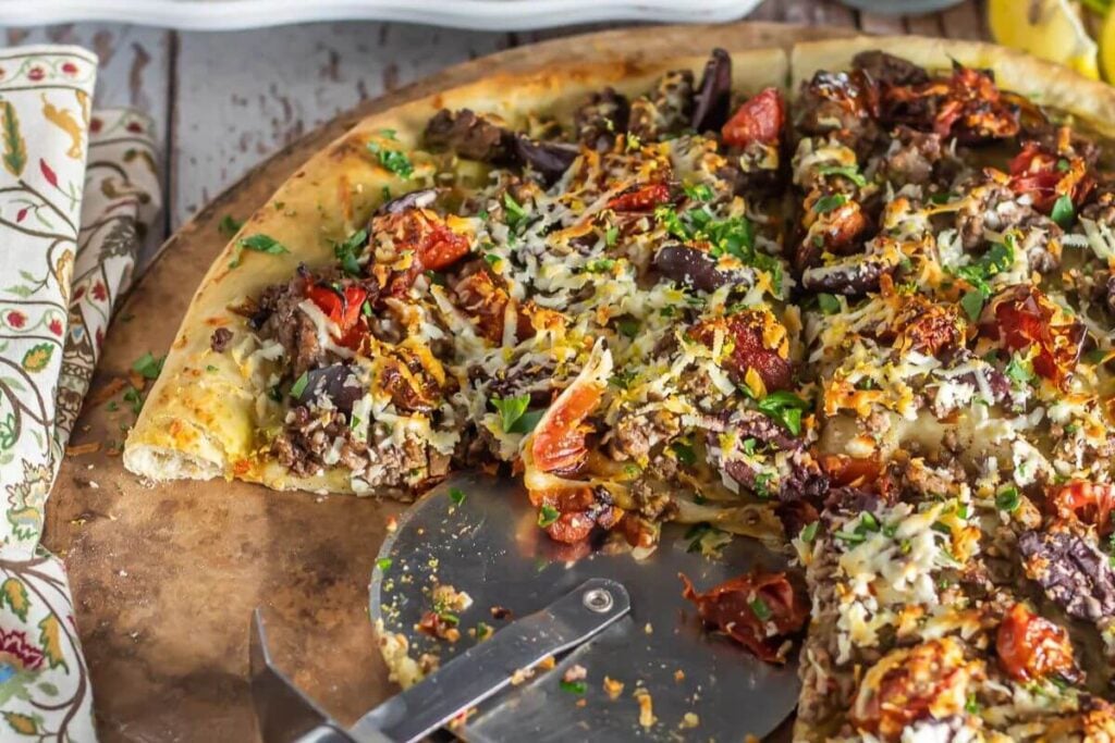 Hearty, flavorful ground lamb, slow-roasted tomatoes, salty kalamata olives and feta, and Greek seasonings come together to create this gourmet pizza.