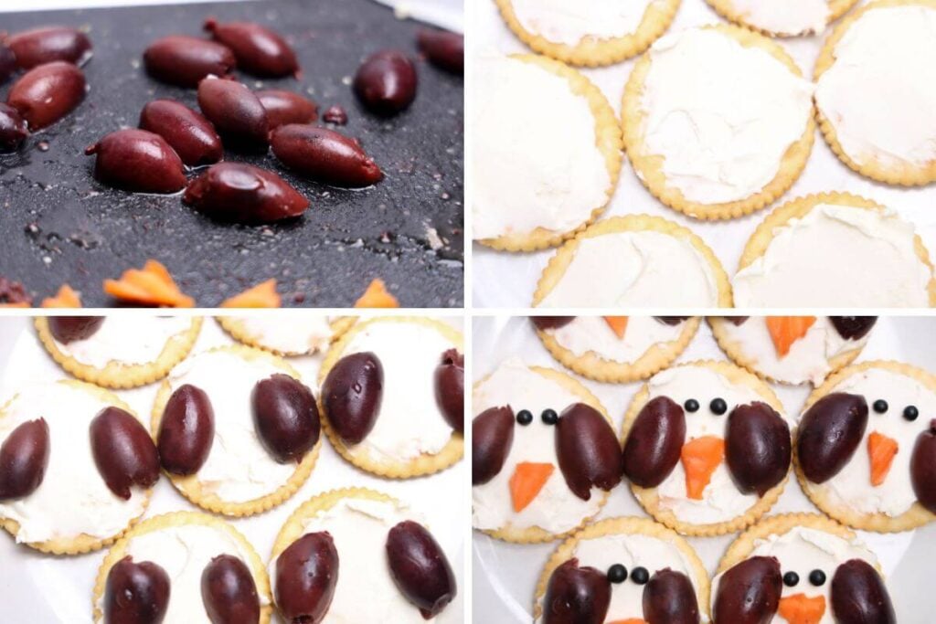 - Cut the olives in half and place them on the cracker to form the penguin body.