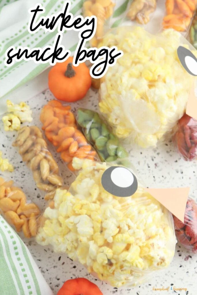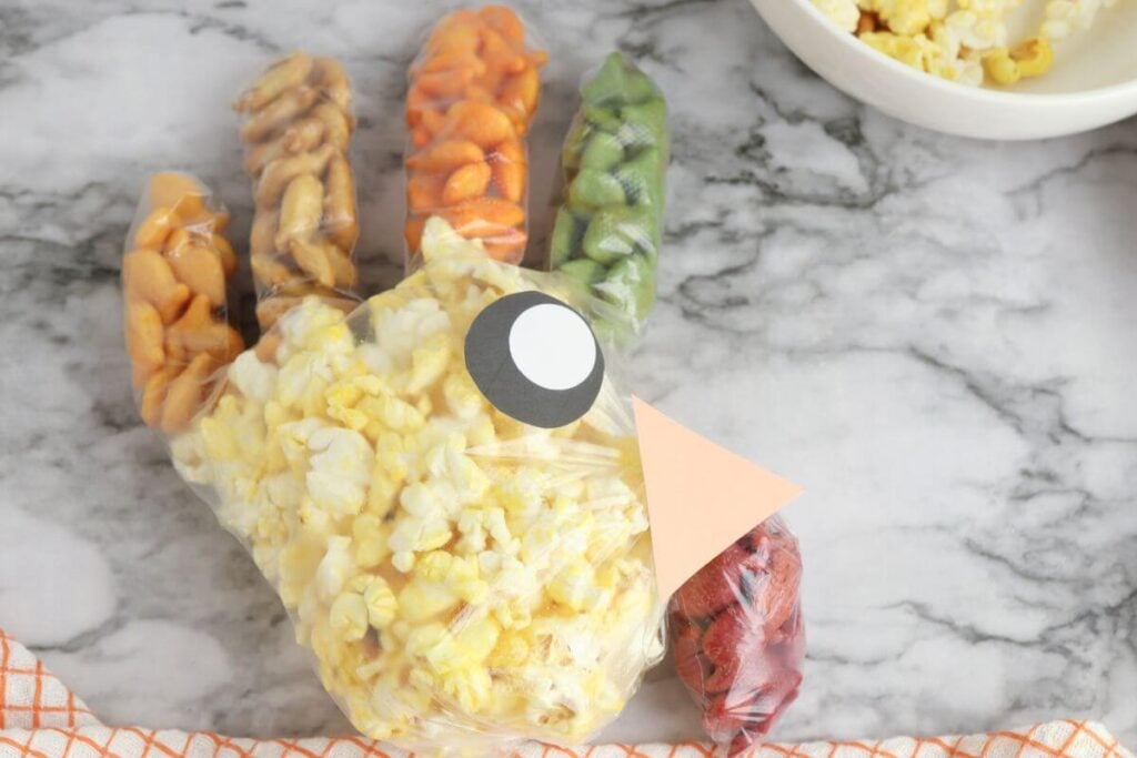 Using popcorn, pretzels, Goldfish crackers, plastic gloves, and a little creativity, these easy turkey snack bags for Thanksgiving are a fun treat to celebrate the season or holiday with.